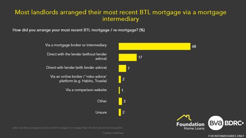 This was apparent in the Q1 2023 BVA BDRC Landlord Panel research – in conjunction with Foundation Home Loans – which found that over two-thirds (68%) of landlords arranged their most recent BTL mortgage via a mortgage intermediary. 17% were reported to arrange their borrowing directly with a lender (without lender advice), 7% directly through a lender (complete with lender advice), 2% via an online broker or robo-advice platform and 1% via a comparison site. In addition, 3% or respondents said ‘other’ and 2% were unsure.