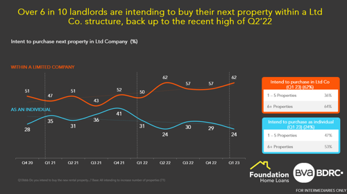Those with larger portfolios are significantly more likely to purchase in a limited company structure (64% of 6+ property landlords versus 36% of those with 1 – 5 properties). In addition, 75% of a limited company landlord’s portfolio is held within a company structure, up by 14% since Q4. This is said to be driven by the average number of properties held in a limited company increasing by 2.6 properties in Q1 2023 vs. Q4 2022