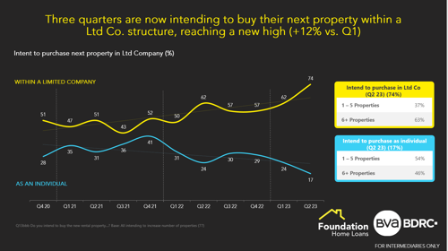 In fact, according to the Q2 2023 Landlord Panel research from BVA BDRC – in conjunction with Foundation Home Loans – almost three quarters (74%) of respondents are now intending to buy their next property within a limited company structure, a figure which represents a new high (+12% vs. Q1).