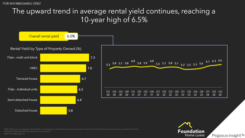 The recent Q3 2024 Landlord Trends report by Pegasus Insight for Foundation Home Loans highlights these trends, showing a steady rise in average rental yields, reaching a 10-year high of 6.5%. Regionally, landlords in Yorkshire & the Humber recorded the highest yields at 7.6%, while the East of England and Central London reported the lowest at 5.5% and 5.6%, respectively. Higher-than-average yields are also common among HMO and student landlords, with typical yields of 7.1%.