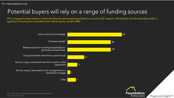 In terms of how they intended to fund any future purchase, multiple answers were allowed, with 48% responding that they would use a buy-to-let mortgage, 38% said they would purchase it outright, 38% would release equity from existing properties, while 15% said they would use funds drawn down from a pension pot.