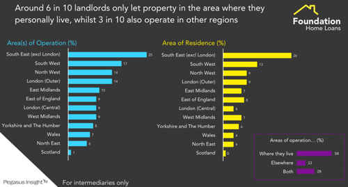 Around 6 in 10 landlords only let property in the area where they personally live, while 3 in 10 also operate in other regions. Just 13% exclusively let property in regions outside the area where they personally live. It remains the case that London and the South dominates in terms of landlord activity with 56% of landlords operating in these areas, this is more than have property in the North and Midlands combined (48%).