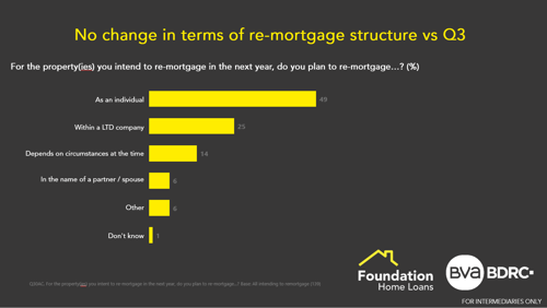 Breaking this down further, most landlords intending to remortgage in the next year, either plan to remortgage as an individual (50%) or within a LTD company (25%), with a minority either unsure at this current moment (14%) or intending to remortgage in the name or their partner/spouse (6%).