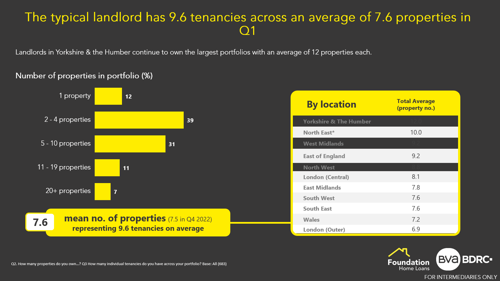 The typical landlord now has 9.6 tenancies across an average of 7.6 properties in Q1. Landlords in Yorkshire & the Humber continue to own the largest portfolios with an average of 12 properties each.