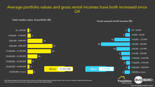 In terms of performance, average portfolio values and gross rental incomes have both increased since Q4. The typical portfolio is reported to have increased to £1.55m (+ approx. £150k compared to Q4 2022) and gross rental incomes have also increased to £70k (+£8k vs. Q4). At an average portfolio size of 7.6 properties, the typical rental property value is £204,079 (+ approx.£17.7k vs. Q4) which generates an annual income of £9,211 or £768 a month (+£79 vs Q4).